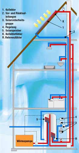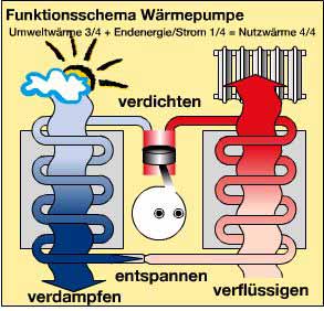 Eine Wärmepumpe funktioniert im Prinzip wie ein Kühlschrank, nur mit umgekehrtem Nutzen. 75% der Heizenergie spendet die Sonne und 25% Antriebsenergie als Strom werden für Ihre Heizung 100% Wärme. Die Wärmeaufnahme aus der Wärmequelle und deren Transport übernimmt ein Arbeitsmittel, das sich in einem geschlossenen Kreislauf bewegt. In diesm Kreislauf wird es verdampft, verdichtet, verflüssigt und entspannt. Die Wärmepumpe wandelt so Wärme niedriger Temperatur (z.B. 0 °C) in Wärme hoher Temperatur (z.B. 35°C) um.